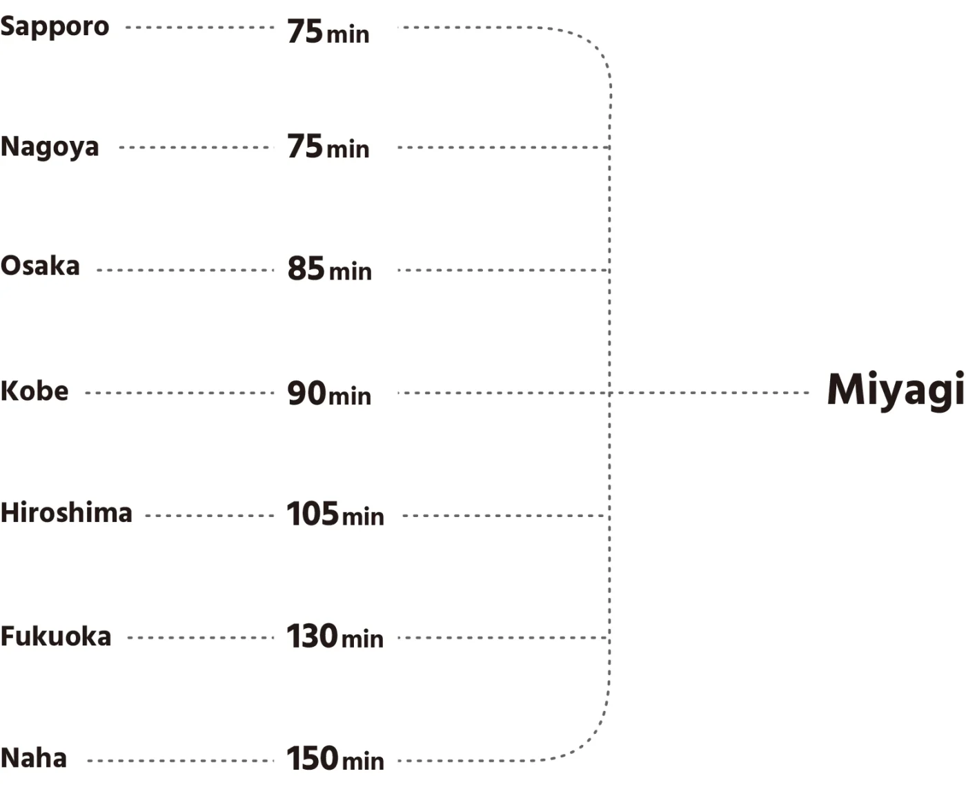 L'aéroport de Sendai propose des vols internationaux directs reliant Sendai à Séoul, Taipei, Shanghai et Bangkok. Des vols domestiques directs desservent également de nombreuses villes à travers le Japon. Les temps de vol domestiques estimés sont les suivants: